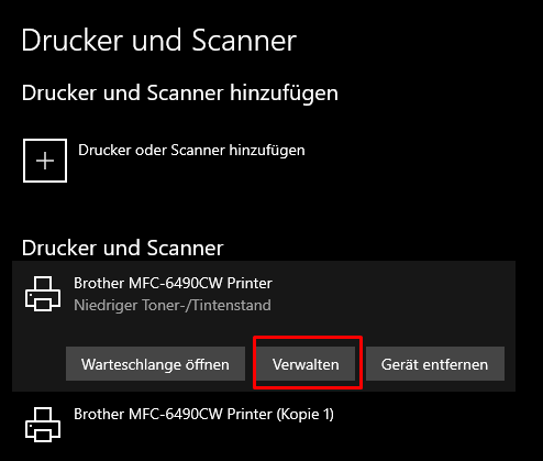 <figure><img src="https://1993141339-files.gitbook.io/~/files/v0/b/gitbook-x-prod.appspot.com/o/spaces%2FHSmnP774EiOo2qQQ8FwO%2Fuploads%2FISOIQiL5zZ1dNi6FDN0z%2Fimage.png?alt=media&#x26;token=b8c874b6-f97f-4f89-ae3f-35f24d1f5414" alt=""><figcaption><p>Drucker auswählen &#x26; "Verwalten" öffnen</p></figcaption></figure>